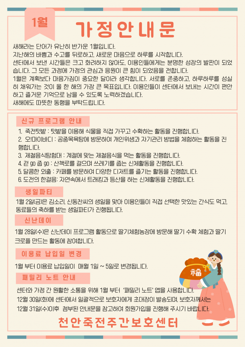 2026년 1월 가정안내문 페이지 정보 작성자 김미리 작성일26-01-05 14:44 조회652회 댓글0건 이전글 다음글 목록 본문 2026년 1월 가정안내문 입니다. 댓글목록 등록된 댓글이 없습니다. 이전글 다음글 목록