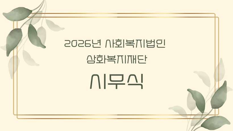 2026년 사회복지법인 삼화복지재단 시무식 페이지 정보 작성자 운영자 작성일26-01-02 17:56 조회6회 댓글0건 관련링크 목록 본문 2026년 사회복지법인 삼화복지재단 시무식 진행하였습니다.2025년 잘 마무리 진행하였고 새롭게 2026년 시작하였습니다.2025년에 사랑과 나눔, 후원, 봉사를 진행해주신 모든 분들께 감사드리며 2026년에도 잘 부탁드립니다.새해 복 많이 받으세요! 댓글목록 등록된 댓글이 없습니다. 목록