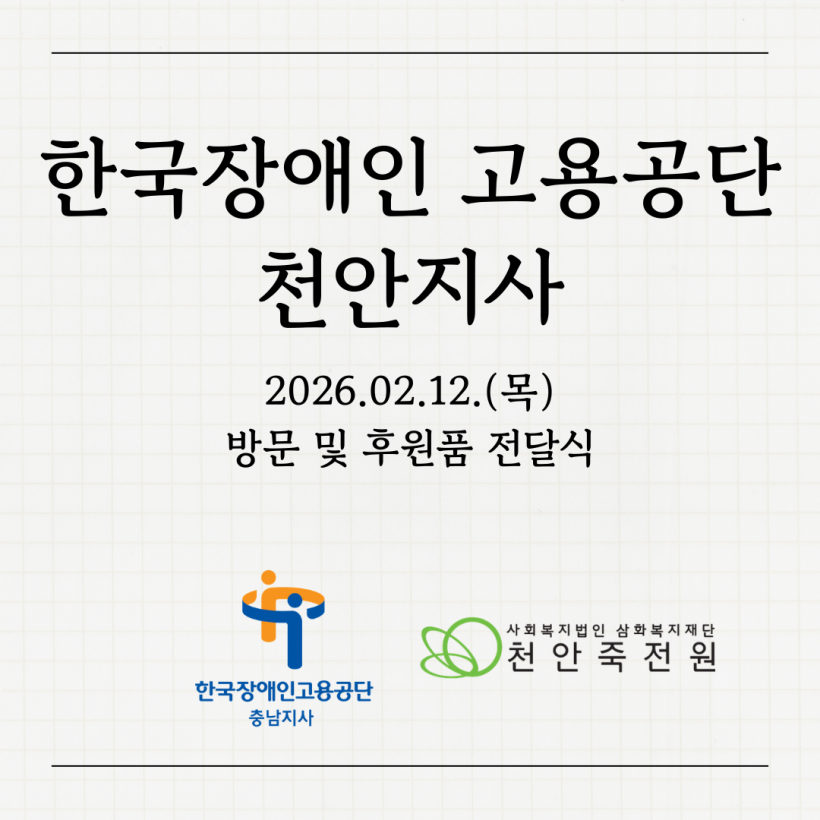 한국장애인고용공단 천안지사 방문 페이지 정보 작성자 운영자 작성일26-02-23 16:00 조회3회 댓글0건 관련링크 목록 본문 26.02.12.(목)한국장애인고용공단 천안지사에서 임직원분들이 방문해주셨습니다.항상 따뜻한 관심과 소중한 나눔을 해주시는 한국장애인고용공단 천안지사 임직원 분들께 감사드립니다. 댓글목록 등록된 댓글이 없습니다. 목록